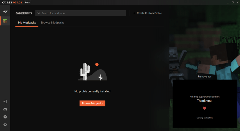 modは、上のタブもしくは、真ん中にある「Browse Modpacks」を押すと、modを探すためのページに移ります。